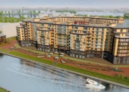 Жилой комплекс Ostrov представляет собой один корпус, создающий закрытый от посторонних уютный двор. |
